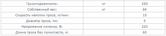 Она подходит для перемещения тяжелых грузов вертикально, горизонтально и под наклоном. Это модель полупромышленного класса, рассчитанная на циклические нагрузки средней интенсивности. Емкость канатного барабана – 60 метров. Для управления применяется кнопочный пульт с проводом.